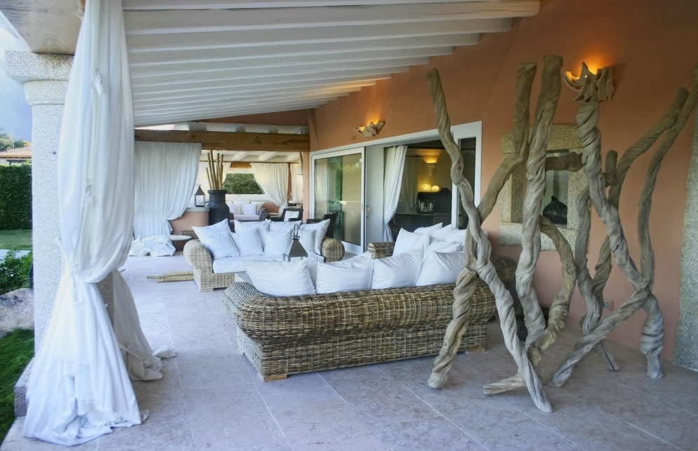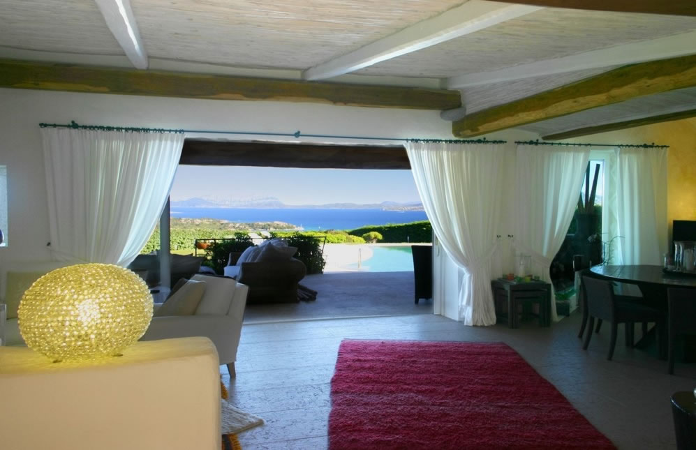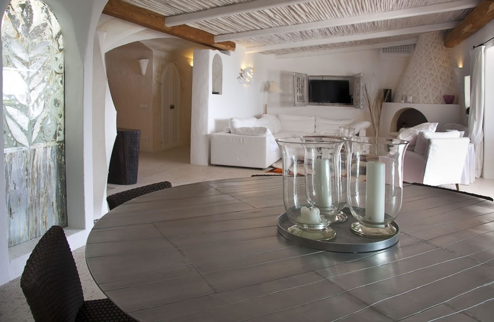 La villa offre cinque camere da letto, tutte con bagno privato e ingresso indipendente, pensate per garantire riservatezza e comfort. La zona giorno, ampia e accogliente, è arricchita da un camino in stile sardo e da una sala da pranzo che si apre tramite grandi vetrate scorrevoli su una veranda coperta elegantemente arredata. Qui si trovano un raffinato spazio pranzo all’aperto e una zona living all’ombra, ideali per momenti di convivialità con vista mare.