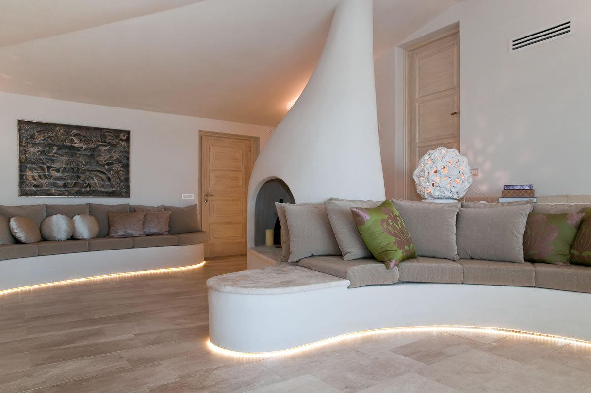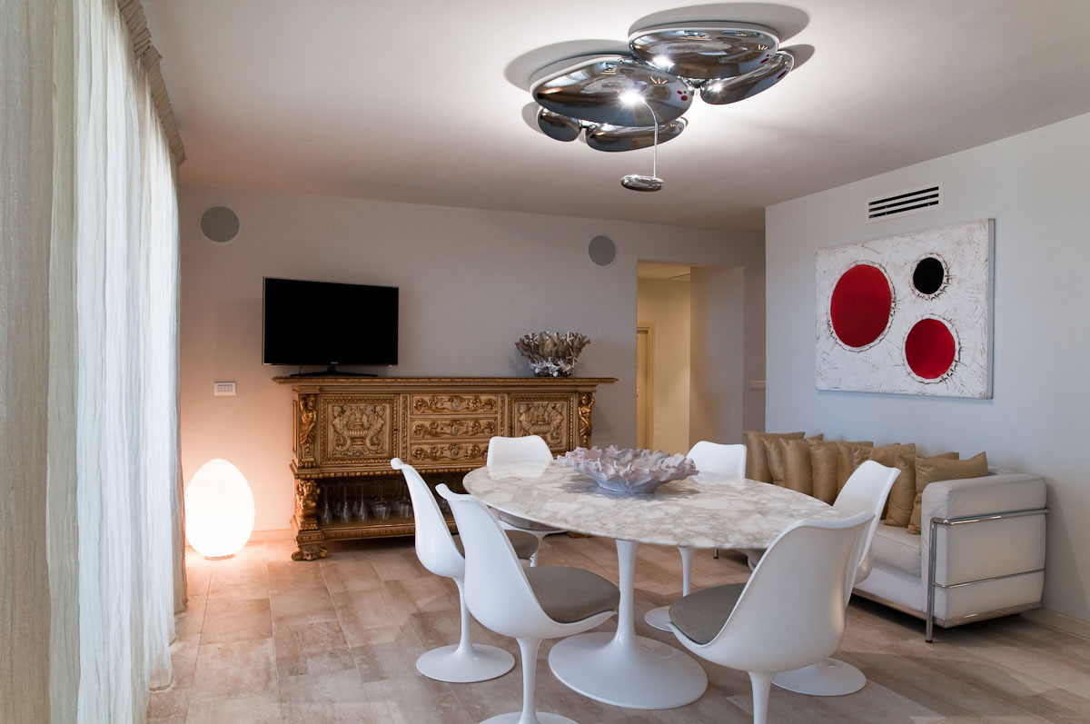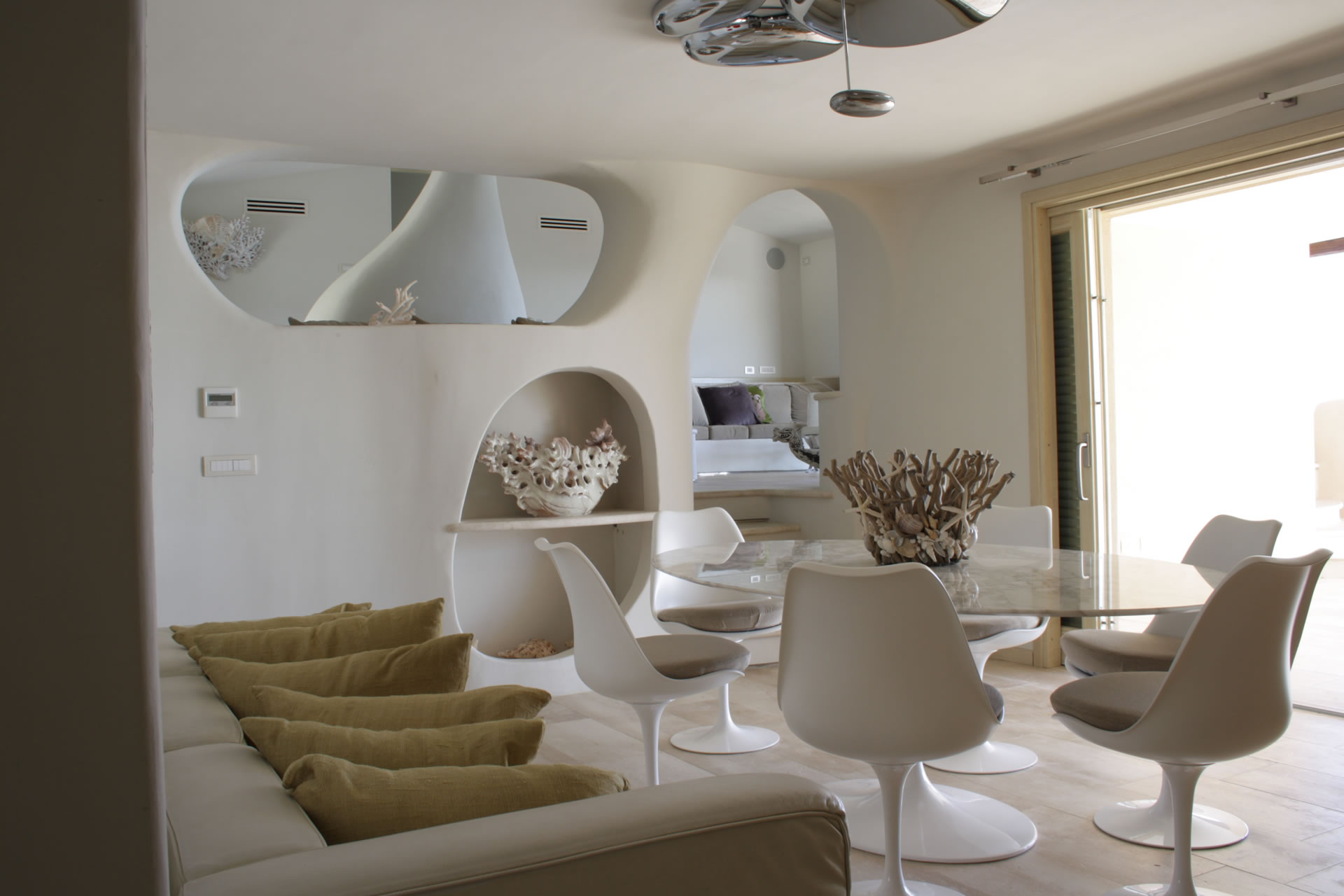 L’architetto ha reinterpretato il concetto tradizionale di villa mediterranea, creando ambienti esterni che assicurano privacy ma al tempo stesso si aprono al paesaggio circostante. Le linee architettoniche sono fluide, i materiali ricercati. I contrasti cromatici forti, abbinati ad arredi di design essenziali ma sofisticati, conferiscono carattere e personalità all’intero progetto.