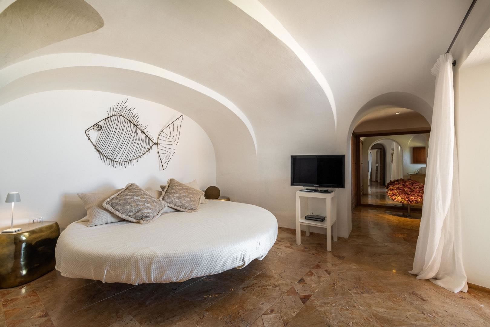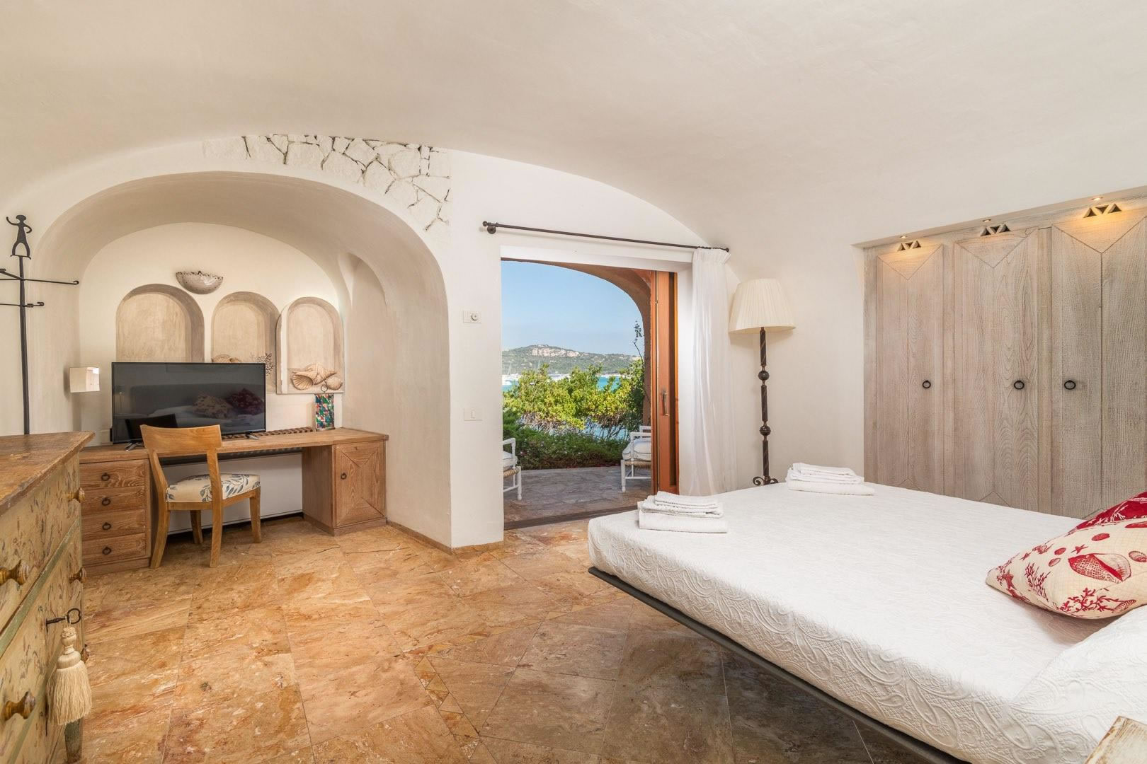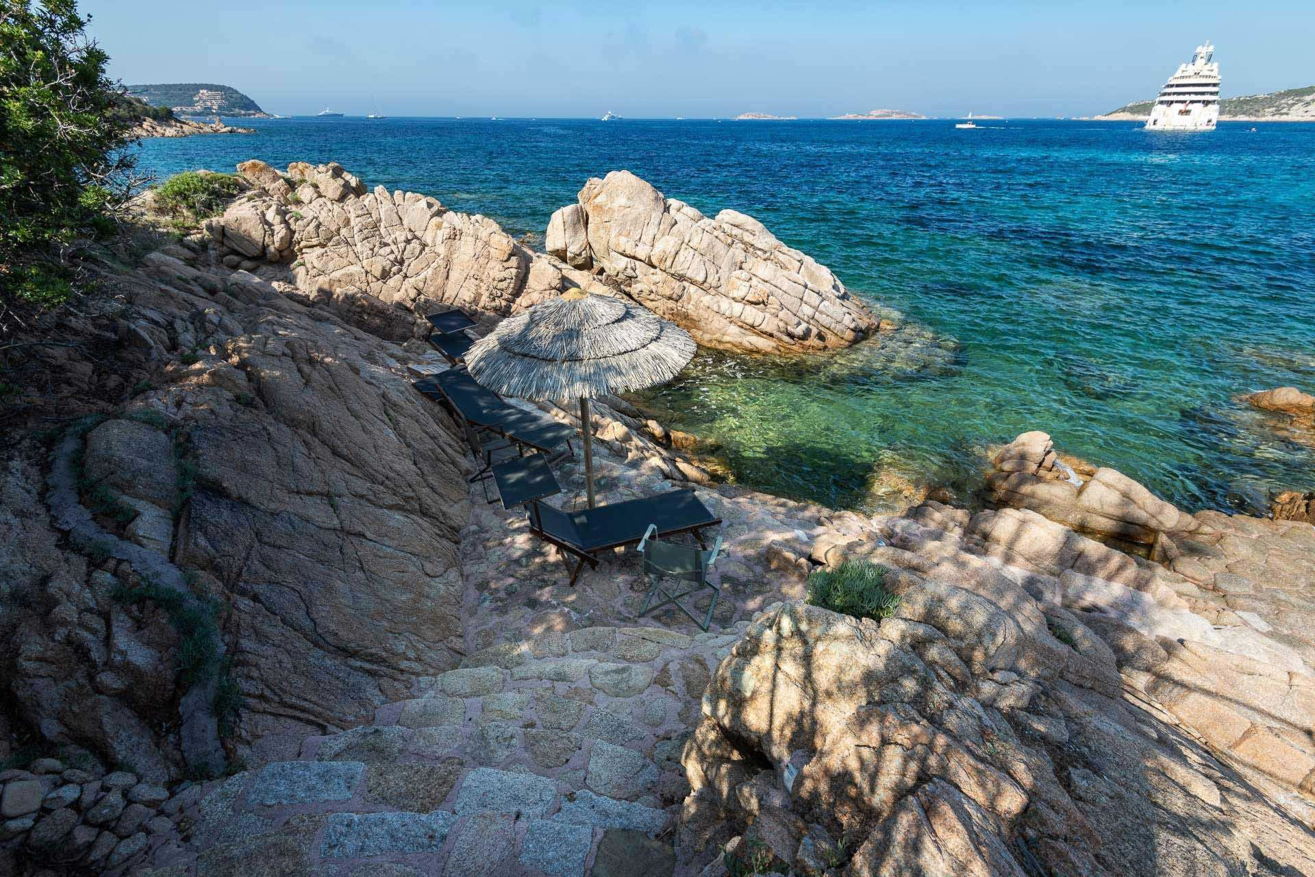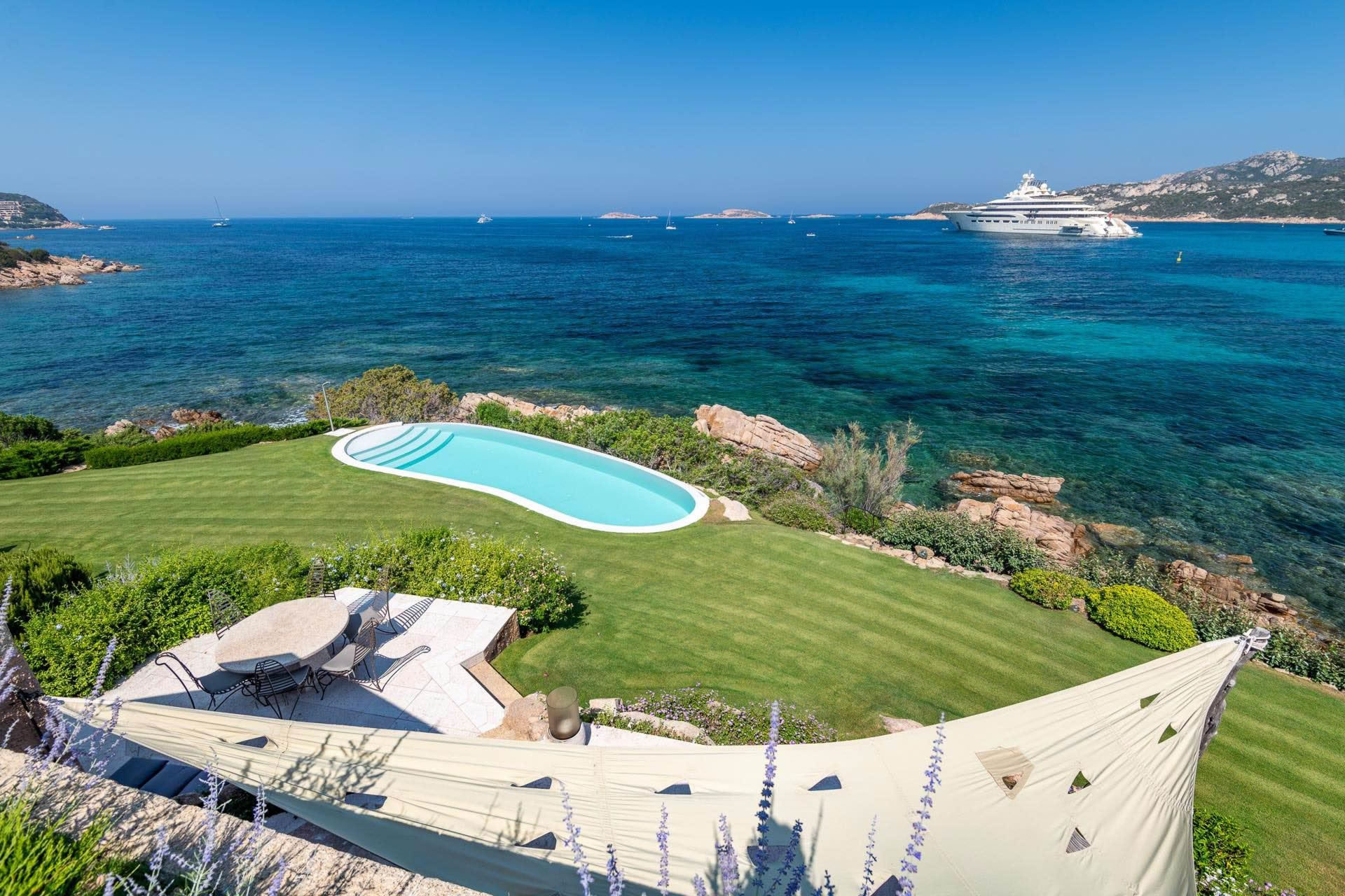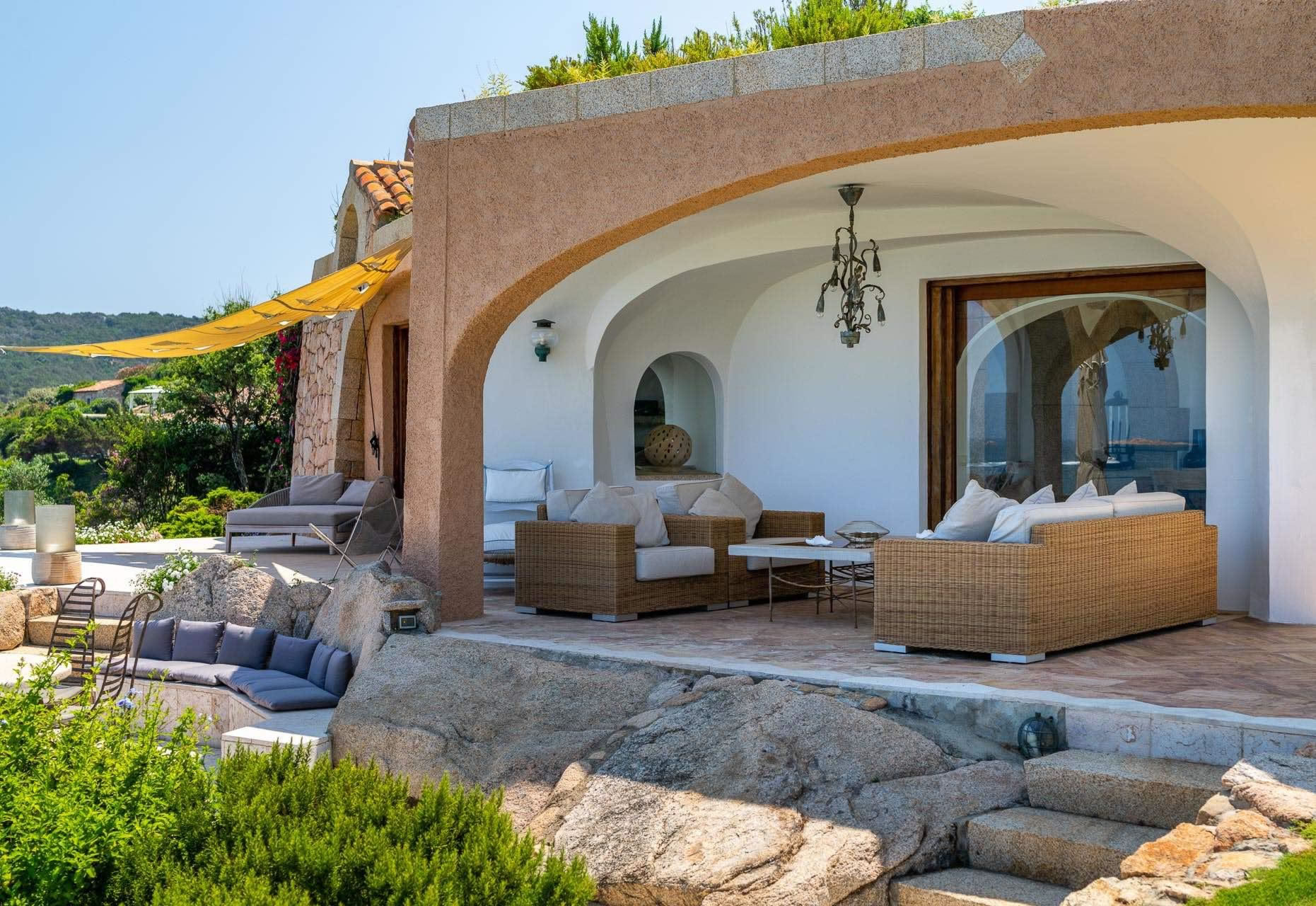 Il giardino, curato in ogni dettaglio, è una vera estensione naturale della casa: un percorso profumato e riservato che conduce fino al mare. Al centro della scena si trova la splendida piscina con vista panoramica, da cui si può ammirare l’intera baia del Pevero e i suoi colori cangianti, che si trasformano con la luce del giorno e la stagione.
